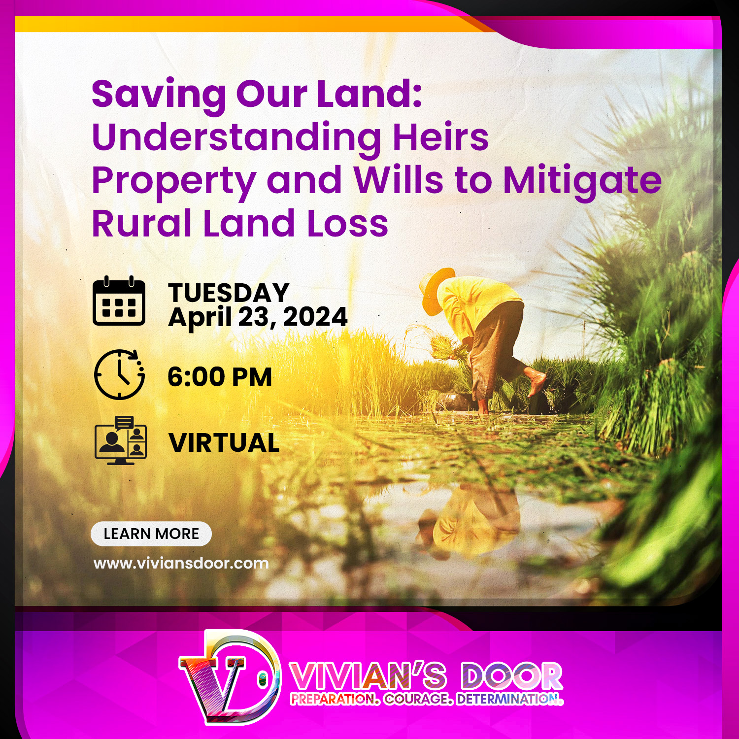 Farmers often face challenges with farmland property issues that prevent them from applying for the Discrimination Financial Assistance Program. Recognizing this need, we have organized a Farmers’ Town Hall to explore the complexities of heir property issues and provide expert guidance.