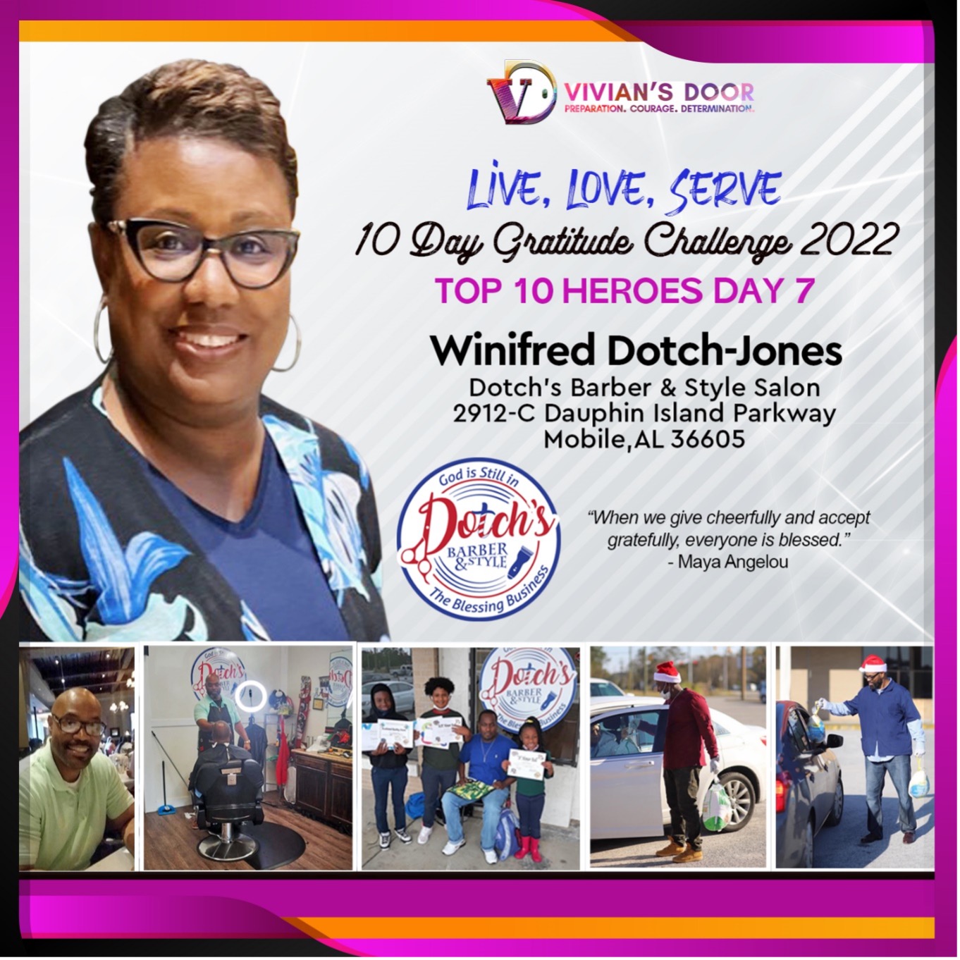 In addition to her position in healthcare, she is also a co-owner of Dotch’s Barber & Styles. Winnie’s father bequeathed this barbershop and personal care business to her and Joe, her brother, in 2015. Together, they work hard to continue their father’s legacy through community service and advocacy while growing the business. They are third-generation business owners that come from a long bloodline of entrepreneurs. Winnie is passionate about supporting the community and particularly young people. Her business is a Partner in Education at Gilliard Elementary School, and they help young people in other organizations in the Mobile and Prichard areas.