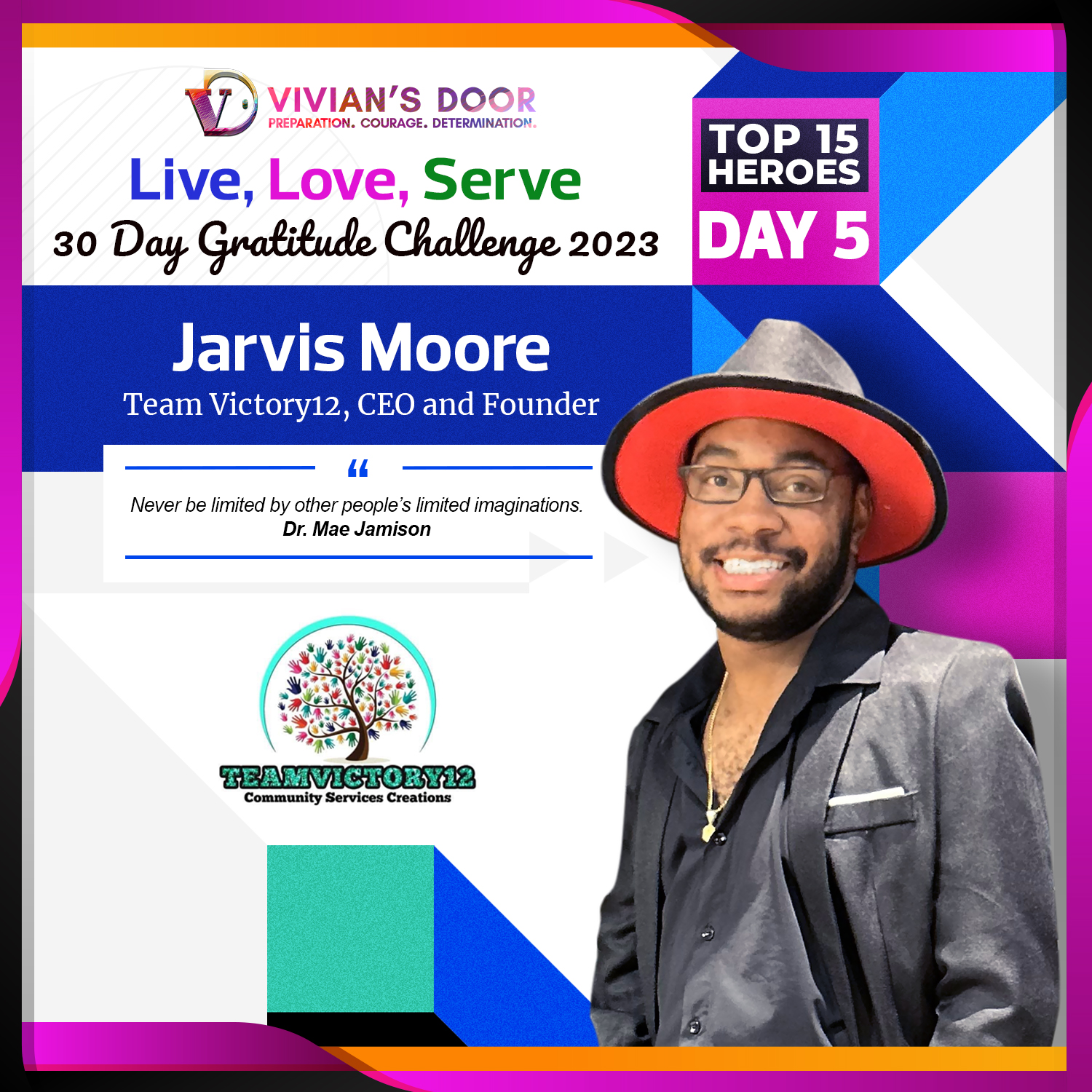 Today, we celebrate – Jarvis Moore, the charismatic CEO and founder of TeamVictory12. Rooted in his personal experience of living with a disability, Jarvis embarked on a mission to educate and support those navigating similar challenges. As the driving force behind his organization, TeamVictory12, which stands for “Together Everyone Achieve More Victory.” Jarvis reflects on the transformative impact of his partnership with Vivian’s Door as we mark the 4th Annual Vivian’s Door Heros of Gratitude Challenge.