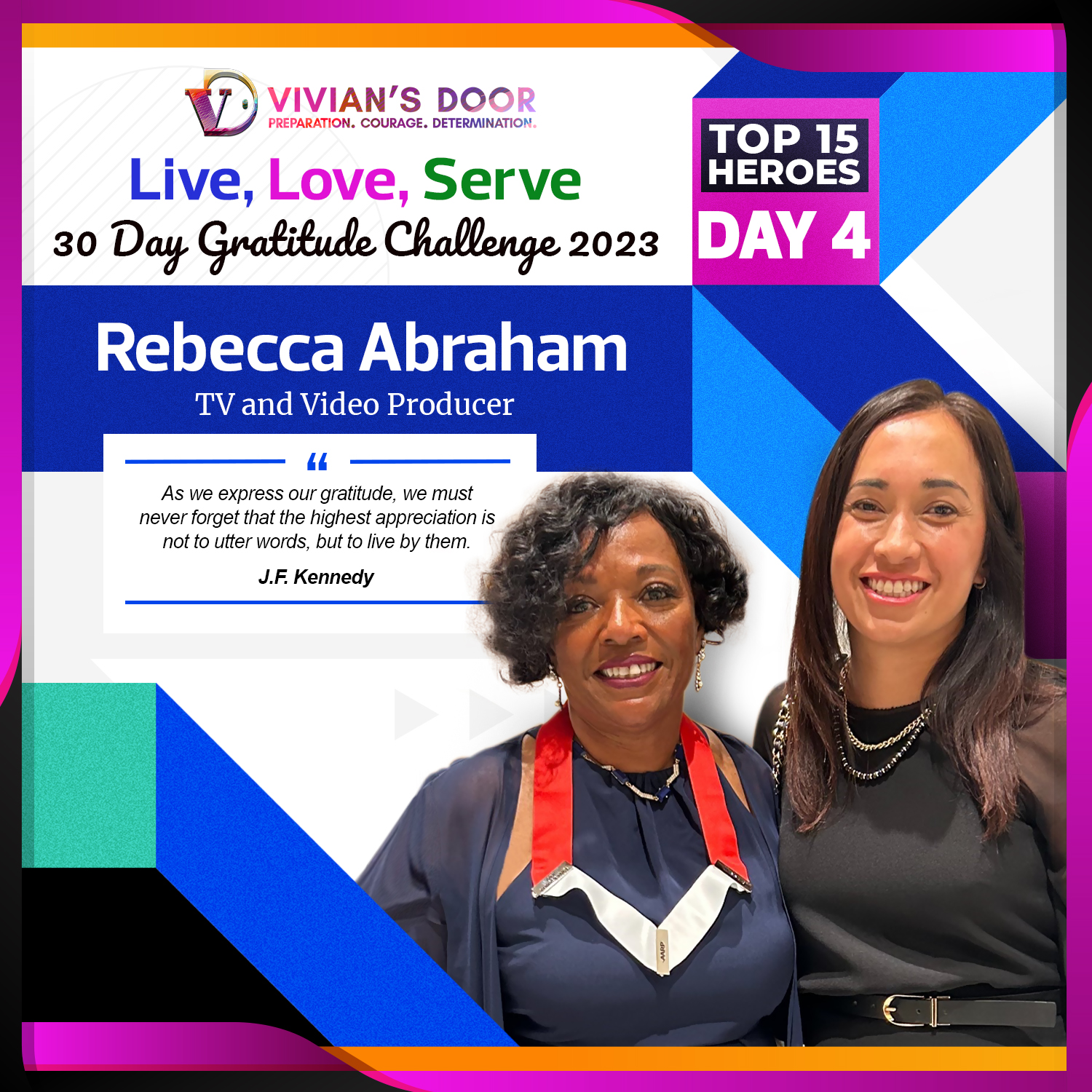 Rebecca Abraham is an amazing TV and video producer. She stands out not just for her creative prowess but also for her commitment to making a positive impact. On this 4th Annual Vivian’s Door Gratitude Challenge, we delve into Rebecca’s journey, her inspiring reasons for supporting Vivian’s Door, and the transformative influence it has had on both her professional and personal life.