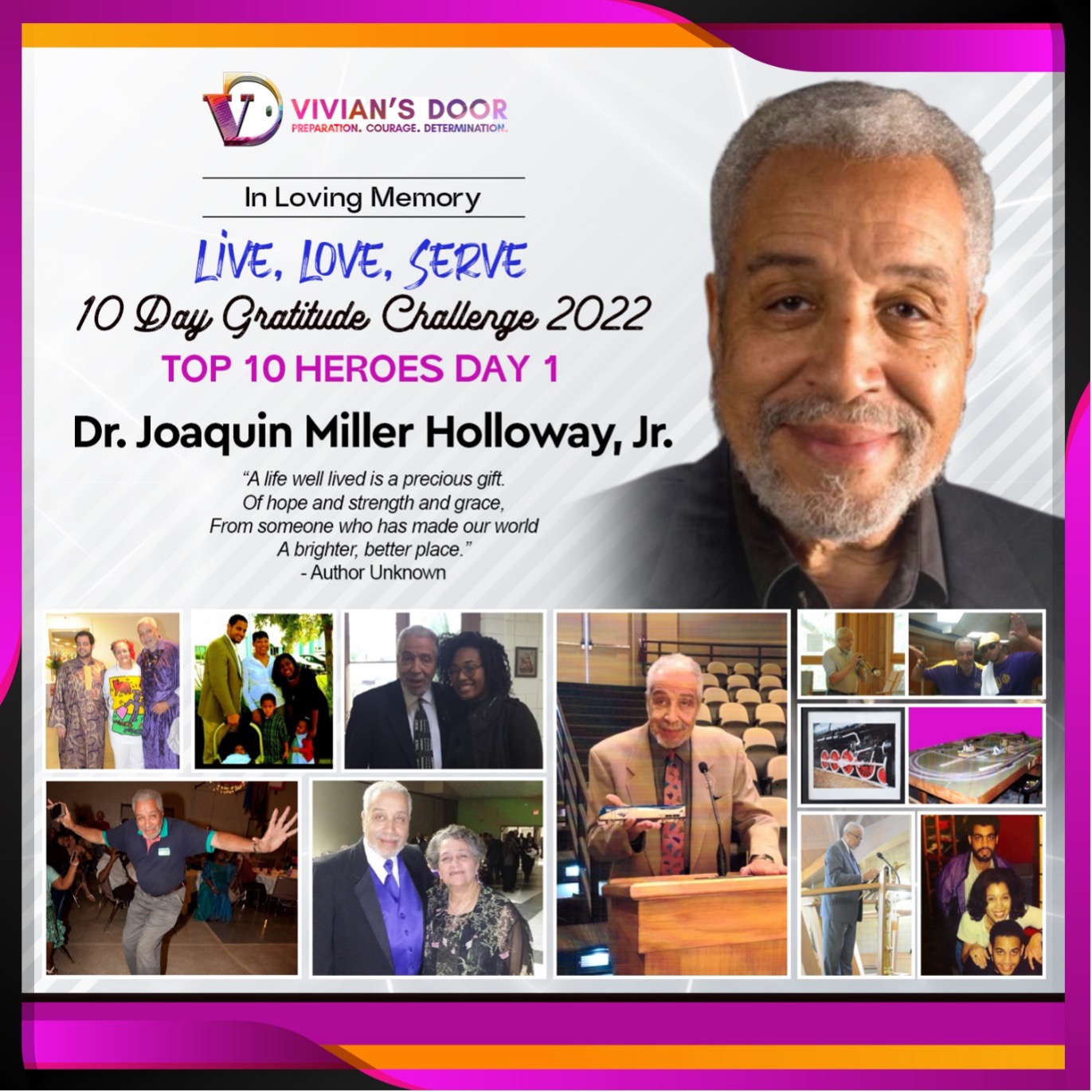 Today, we honor the memory of Joaquin Miller Holloway, Jr., Ph.D. founder of Artistic Photographs by Joaquin and so much more. He lived a long and impactful life. On the day before he transitioned this earthly life, he called Vivian’s Door to thank us for all the excellent work we do in the community and for honoring him as a hero of gratitude. We applaud Joaquin’s inspiration and contribution to our mission. He was an enormous supporter, always providing humor and advice and consistently donating to our fundraisers. We want to share with you what he thought about our work and mission; “helping small business owners build wealth for themselves and their marginalized communities, overcome systemic poverty, and the short supply of venture capital.”