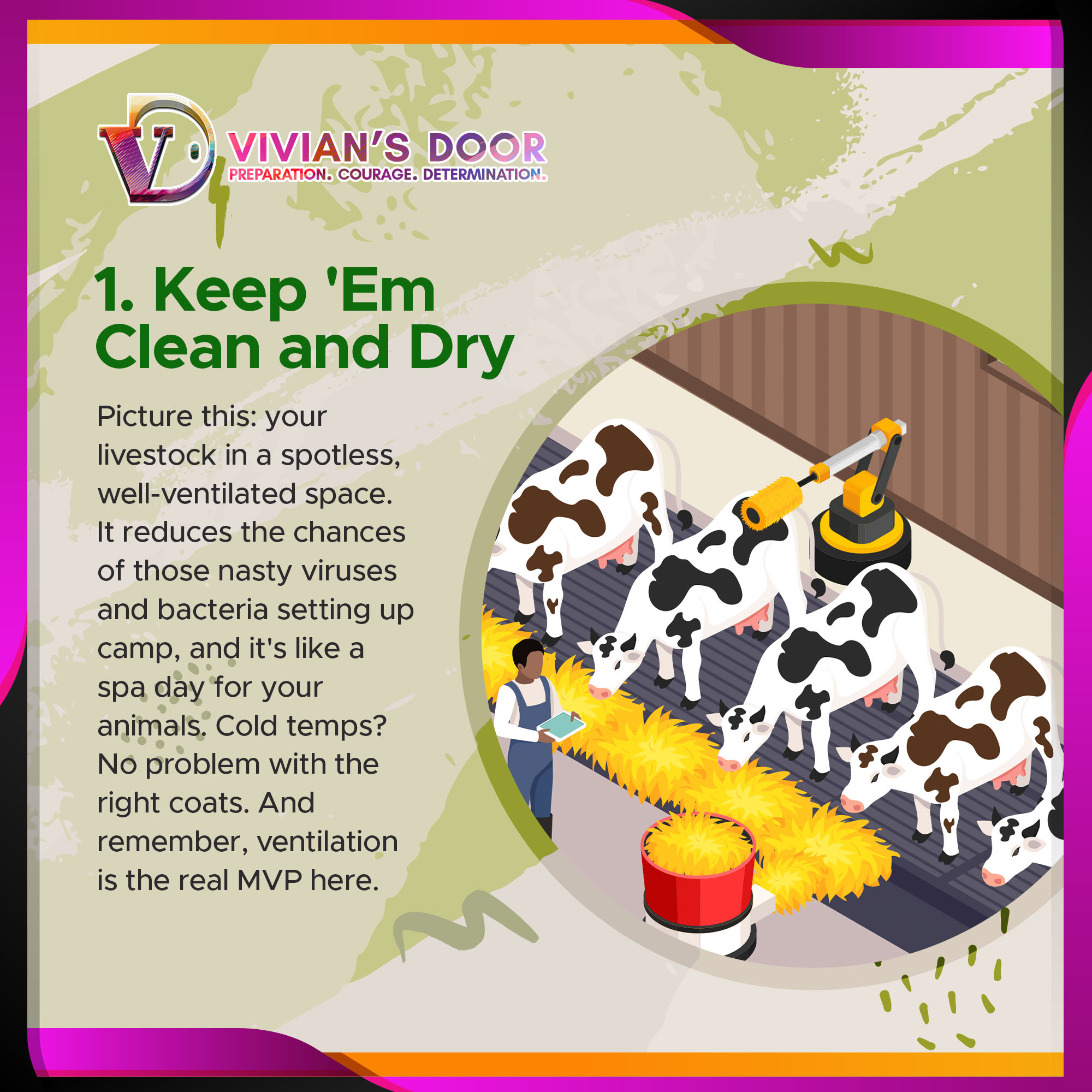 Picture this: your livestock in a spotless, well-ventilated space. It reduces the chances of those nasty viruses and bacteria setting up camp, and it’s like a spa day for your animals. Cold temps? No problem with the right coats. And remember, ventilation is the real MVP here.