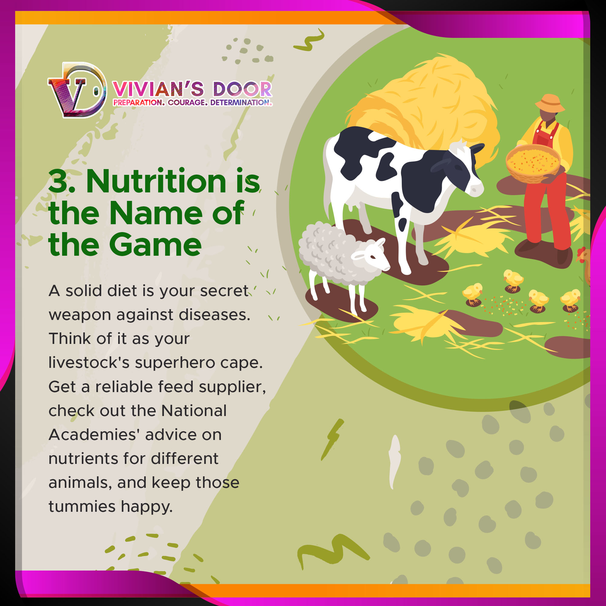 A solid diet is your secret weapon against diseases. Think of it as your livestock’s superhero cape. Get a reliable feed supplier, check out the National Academies’ advice on nutrients for different animals, and keep those tummies happy.