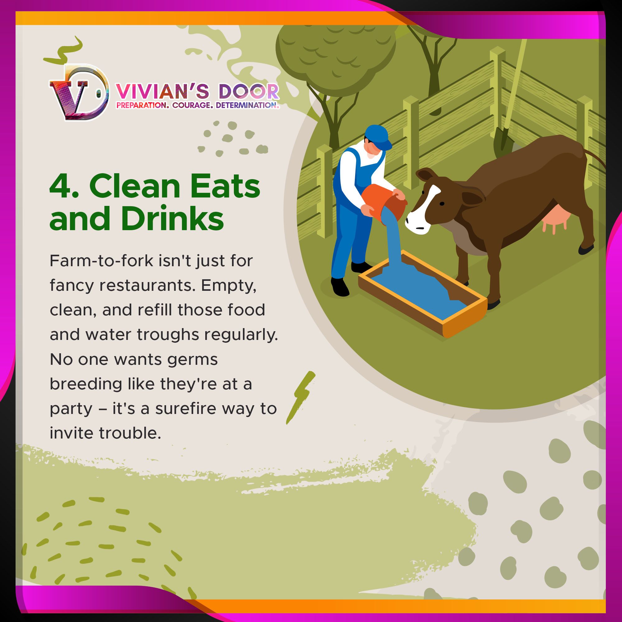 Farm-to-fork isn’t just for fancy restaurants. Empty, clean, and refill those food and water troughs regularly. No one wants germs breeding like they’re at a party – it’s a surefire way to invite trouble.