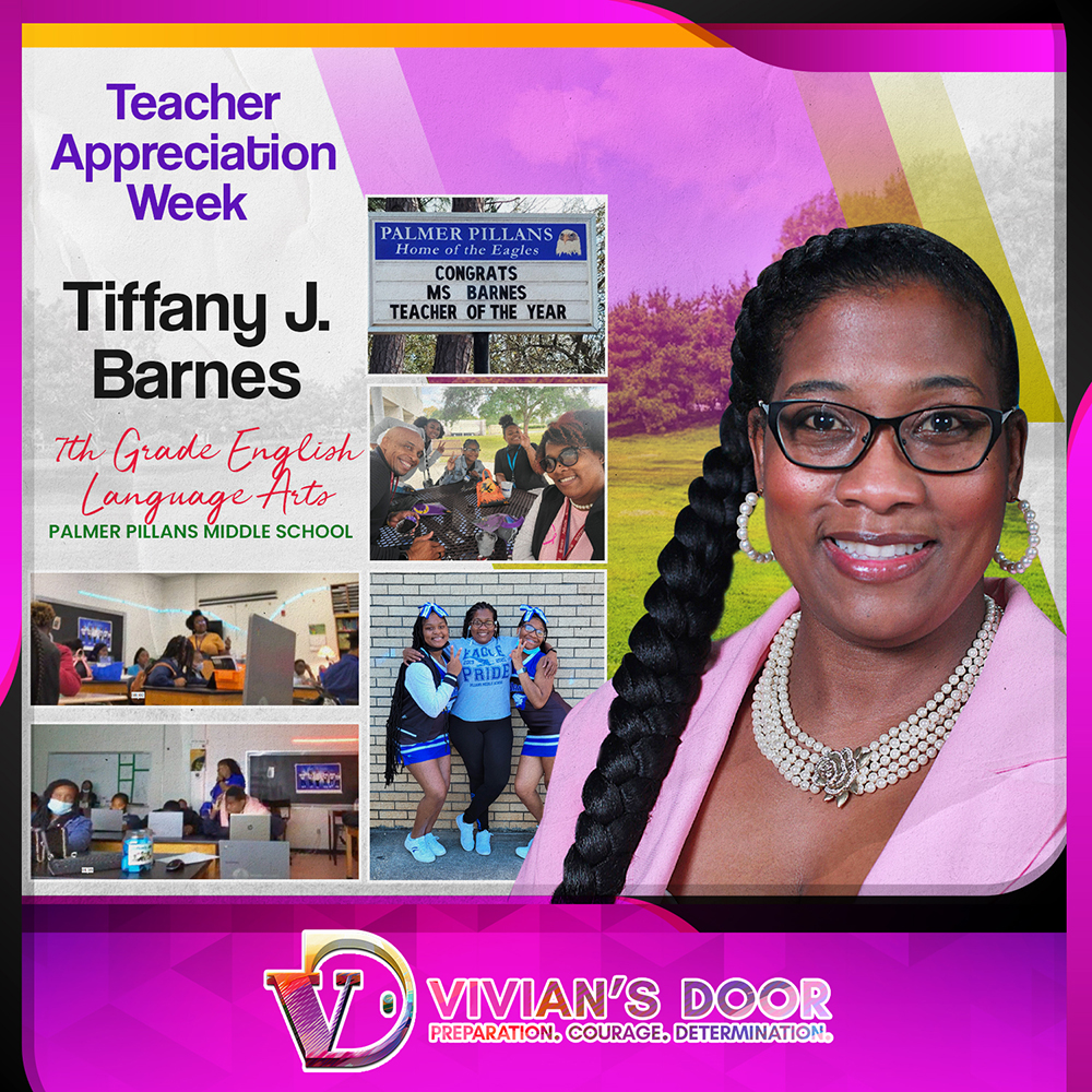 Meet Tiffany J. Barnes, a seventh-grade English Language Arts teacher at Palmer Pillans Middle School. She is diligent, transformative, and creative. These qualities are reflected in her teaching style. Tiffany’s favorite quote is from Rev. Dr. Martin Luther King, Jr., who said, “The function of Education is to teach one to think intensively and to think critically. Intelligence plus character – that is the goal of true Education.”
