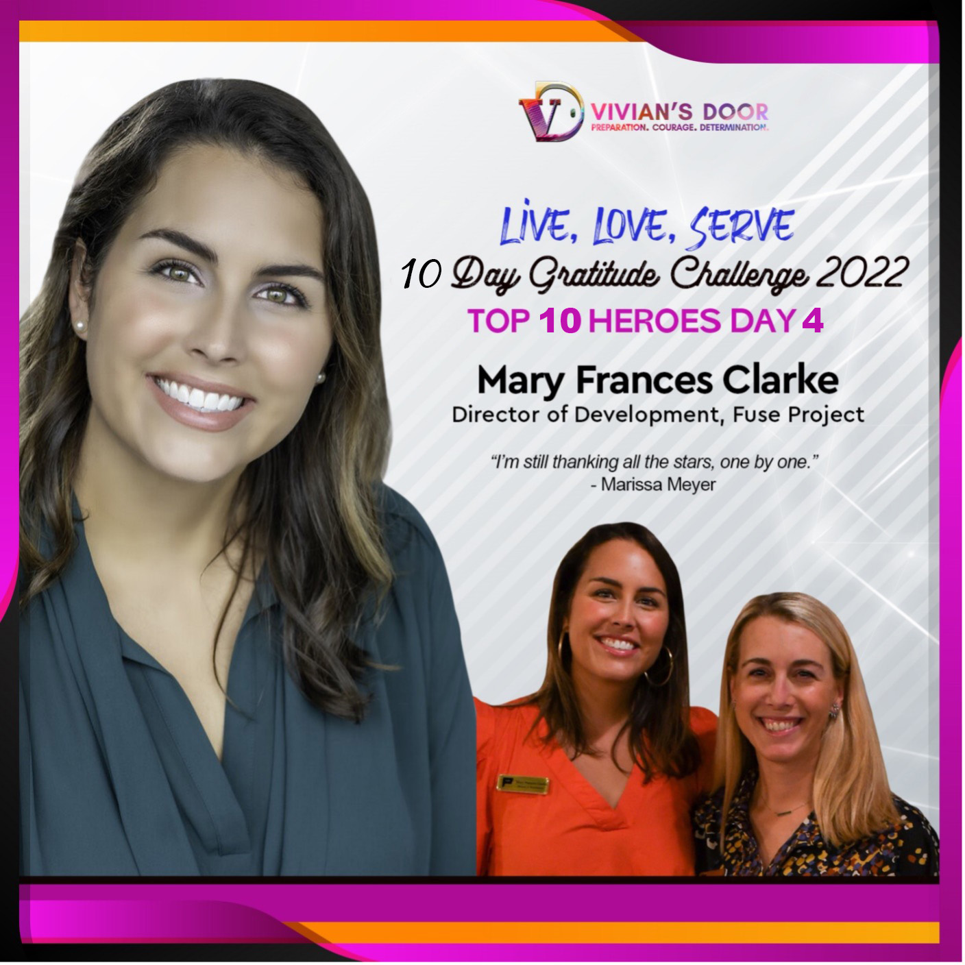 Here’s a one-two punch for you today: we’re excited to celebrate Mary Frances Clarke, another great Fuse Project team member. Ms. Clarke is the Director of Development at Fuse Project, a nonprofit organization based in Mobile, AL. She’s a remarkable helper and friend of our cause who is caring, compassionate, and authentic. She’s strongly supported our work, and we sincerely appreciate her today.