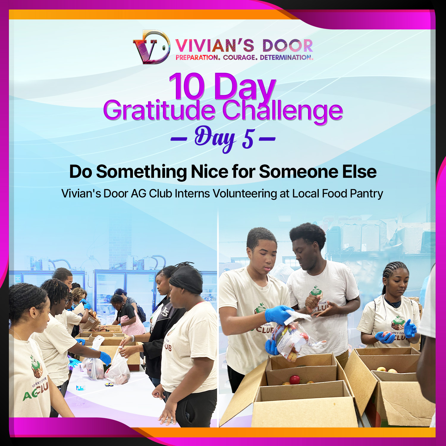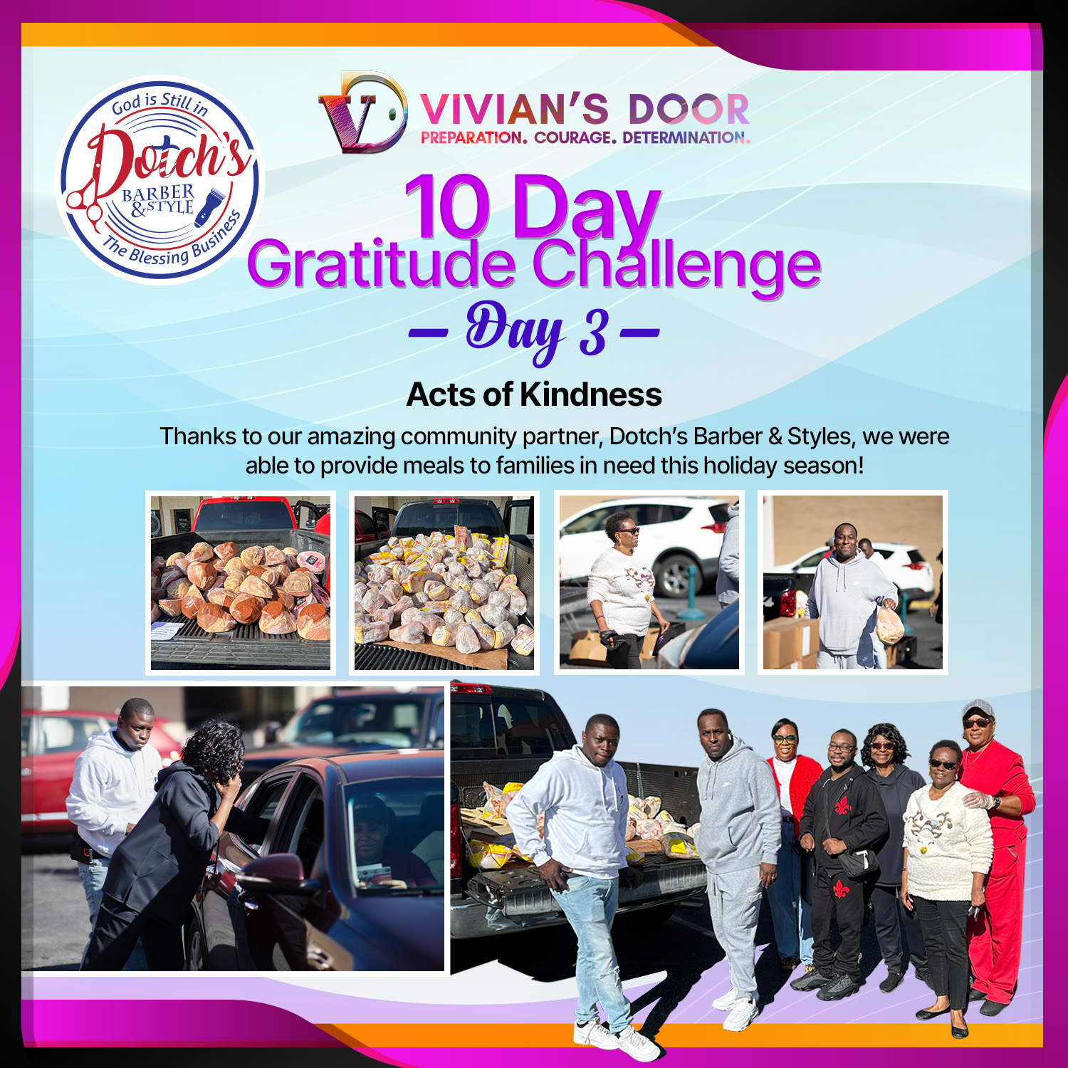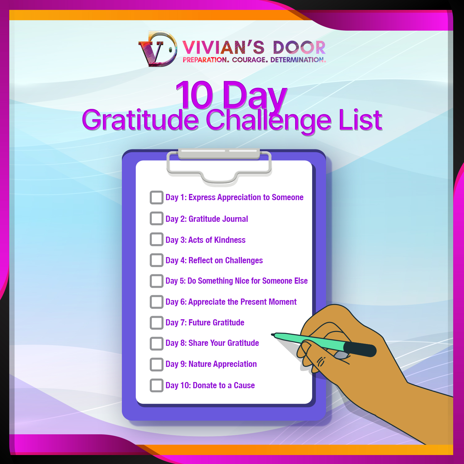 By following this 10-day gratitude challenge, you’ll not only cultivate a habit of appreciation and positivity but also strengthen your connection to the people and community around you. Together, we can see the incredible difference a little gratitude can make. So, let’s embark on this journey of thankfulness with Vivian’s Door—one day, one act of gratitude at a time.
