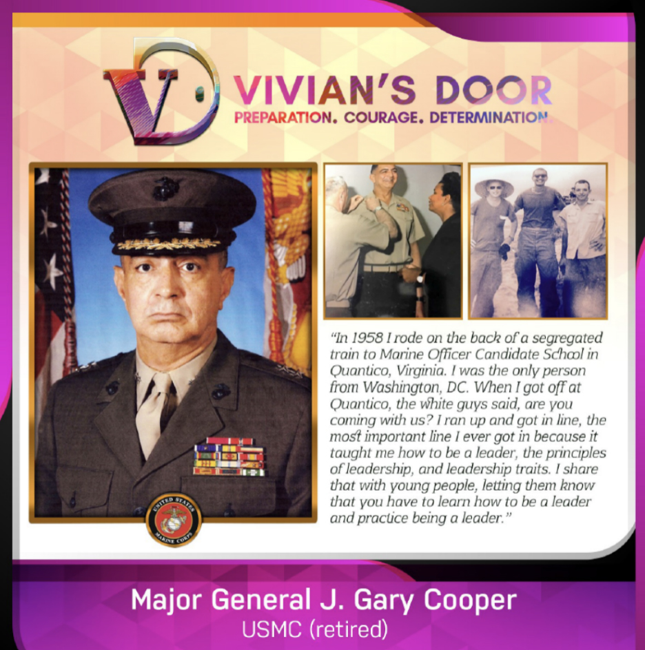 Cooper says, “When I got commissioned, there were 20,000 officers in the Marines, and only six were black. On that day, I knew that I had no choice but to be the absolute best I could be.” From 1958 to 1970, he was an active-duty officer and became the first Black officer in Marine Corps history to lead an infantry company into combat. “Everywhere we went, people watched us; at the commissary; at the post exchange, people watched us because they had never seen a black Marine officer. Although it was only six of us, we made it a point that if we didn’t look as good as everybody else, we would go home and change clothes because we were standing on our ancestors’ shoulders and needed to represent.”